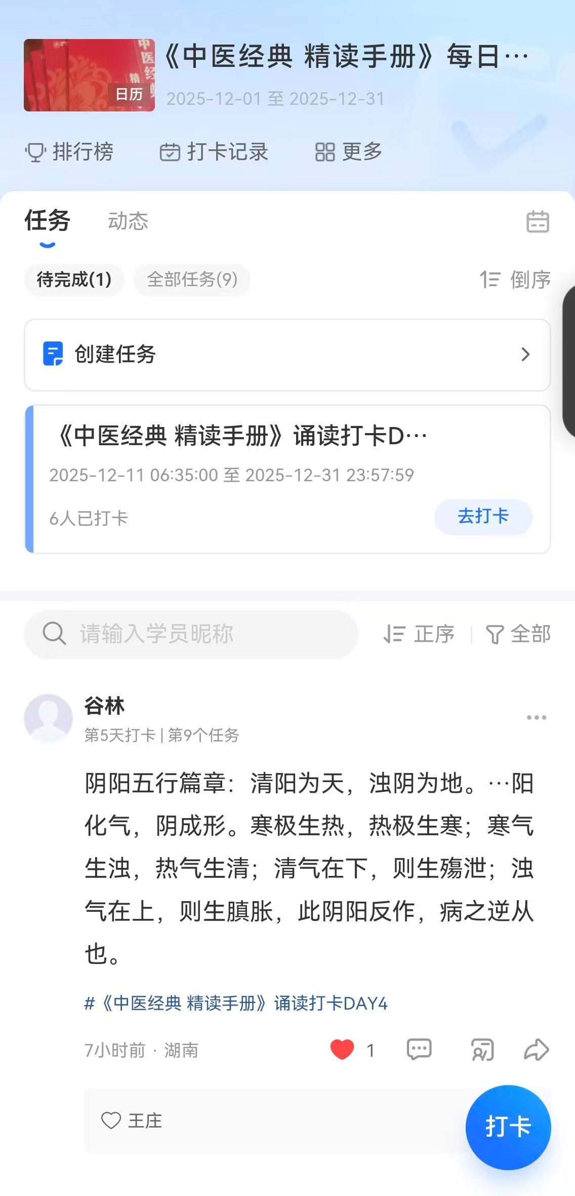 学习结束后,全员在科室工作群进行线上打卡,记录所学所思。打卡模板强调提炼“核心精要”、书写“临证一得”,这不仅是对学习的总结,更是将经典与临床实践相结合的关键环节。日积月累,打卡记录形成科室专属的“数字经典学习档案”,既见证个人成长,也促进高年资医师与青年医师之间的思维碰撞、教学相长。