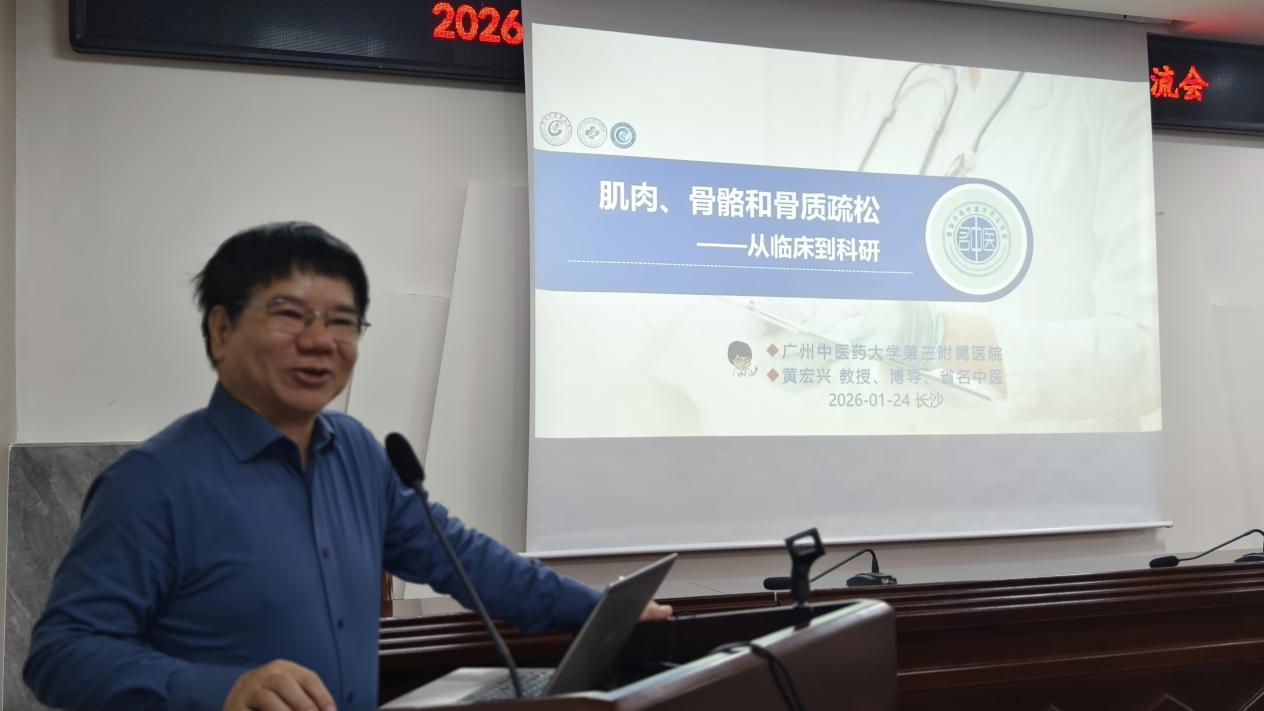受聘仪式后,进入了精彩的学术交流环节。黄宏兴教授作了题为《肌肉、骨骼和骨质疏松——从临床到科研》的学术报告,以其在骨质疏松领域的深厚造诣,分享了从临床实践到科学研究的转化路径,见解独到,启发性强。