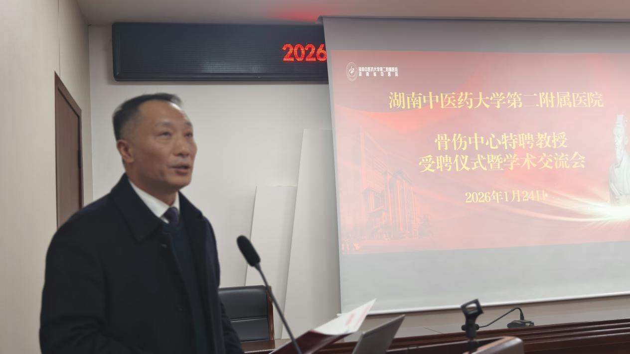 谢海波在致辞中代表医院党政领导班子对各位专家的到来表示欢迎和感谢。他阐释了医院作为“湖湘中医发祥地”“医圣故址”的深厚底蕴,介绍了医院“一院三区”跨越式发展的新格局,特别是高铁西城新院区即将投入使用带来的新机遇。他表示,骨伤中心作为医院学科建设的“璀璨明珠”之一,正处在迈向更高水平的关键时期,聘任黄宏兴教授、王卫国教授为特聘教授,是医院加强学科建设、引育高端人才的重要举措,期望两位教授能成为医院学科发展的“导航者”、科研教学的“助推器”、综合实力提升的“催化剂”,骨伤中心同仁要珍惜机会、虚心学习,将专家智慧转化为发展新动能。