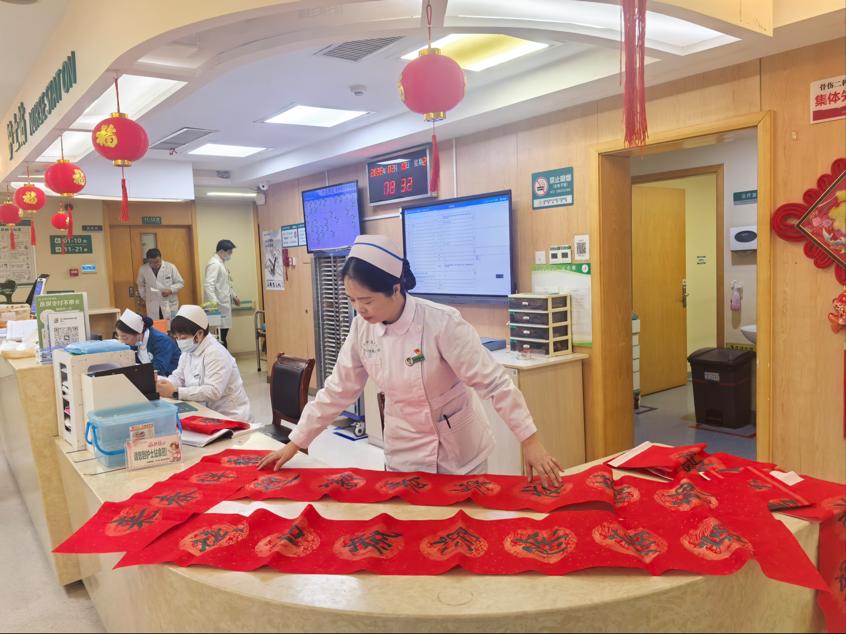 “福”字呈祥,春联寄情,科室工作人员为病友们送上最真挚的新春问候。熊卫华护士长的先生、医院离退休管理办公室主任罗树强主动请缨,精心书写了30多副春联。一副副写有“身体健康平安福,阖家幸福团圆年”“春风送暖入病房,医患同心迎新春”等寓意吉祥、饱含关怀的春联跃然纸上。红纸黑字间,既有对新年的美好期许,更有对患者康复的衷心祝愿。墨香弥漫在科室的每一个角落,原本略显肃穆的病房,因这一抹抹喜庆的中国红而变得暖意融融。