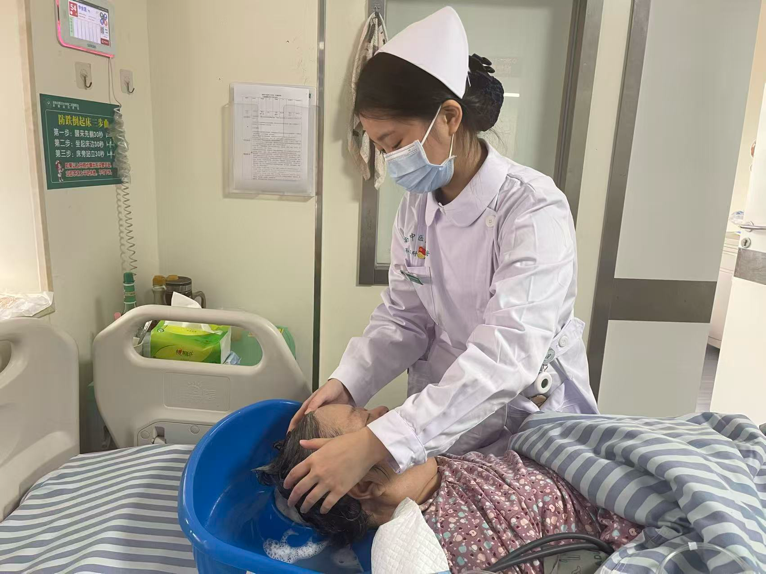长期卧床患者因行动受限难以自行清洁头发,护理团队主动提供上床洗头、护发整理、烘干服务,让患者在病房就能感受清爽与舒适。