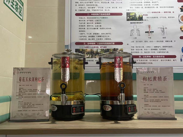 为缓解住院患者的焦虑、改善其睡眠与体质,科室在病区设置中医养生茶角,提供两款特色养生茶:菊花玉米须枸杞茶可清肝明目、利水祛湿、缓解浮肿疲乏。枸杞黄精茶可益气养阴、补脾润燥、改善虚弱体质。患者及家属纷纷表示:“喝一口暖暖的茶,心里也舒服了。”