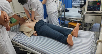 演练中,一位就诊的中年男性患者突然面色苍白、晕倒在地。一站式服务中心工作人员立即查看病人,发现患者意识丧失,第一时间启动应急救援程序,立刻行心肺复苏,人工呼吸,保安人员马上呼叫急诊科医护人员到场参与救治。予球囊辅助呼吸,AED除颤,抗休克,建立静脉通道等急救处置。经过“黄金四分钟”的积极抢救,患者逐渐恢复神志,恢复呼吸,恢复心跳,皮温转暖,予转运推车迅速转送至急诊科重症监护室行进一步复苏治疗。