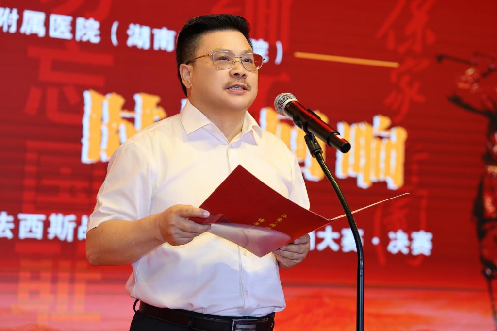 湖南中医药大学党委书记戴爱国出席活动并致辞。他表示,本次大赛将思政教育、职业精神与艺术表达相融合,意义重大且深远。他强调,要以声传情,延续声音中信仰的力量,让抗战精神“活”起来;要以文化人,依托仲景文化发源地的优势,让仲景文化“立”起来;要以行践言,将精神力量转化为实际行动,让使命担当“实”起来。
