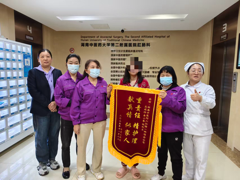 张女士住院期间,医院陪护团队在护理部的规范指导下,为其提供了全方位服务:术前协助其完成各项检查及准备,术后严格遵循肛肠专科护理流程,为她排队换药、协助她温水坐浴,配合护士观察伤口疼痛及恢复情况;生活上,从起居照料到情绪安抚无微不至,张女士康复效果十分理想。她惊喜地坦言,医院专业陪护团队的响应速度和护理水平远超预期。出院时,特意定制锦旗致谢医护团队。