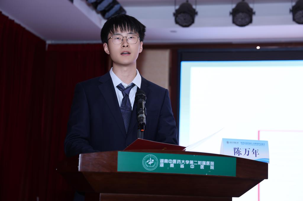 第二中医临床学院陈万年作为研究生代表发言。他以“君臣佐使”为喻,从文明立根、求实筑基、继承传续、创新引路四个维度阐释中医传承,表态将珍惜交流机会,助力中医药事业发展。