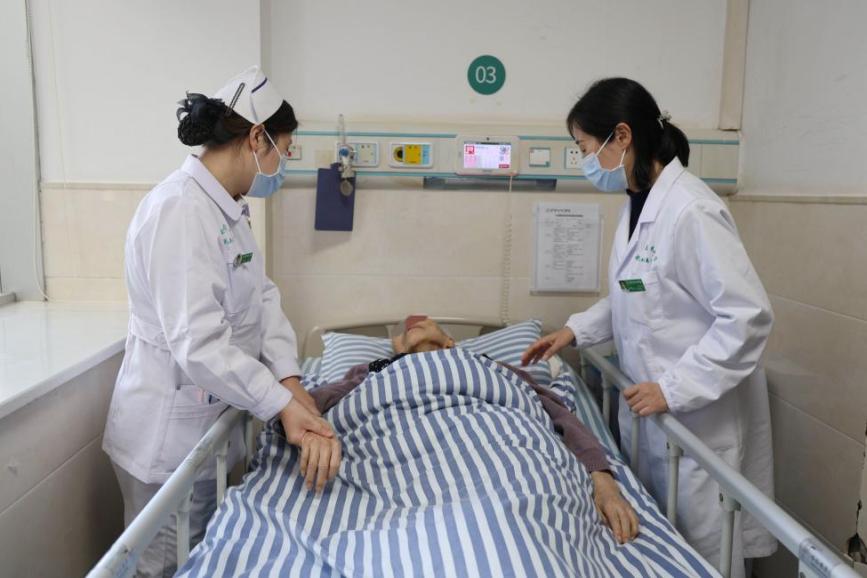 11月28日,在心病科病房,医护人员正在查看李奶奶情况。