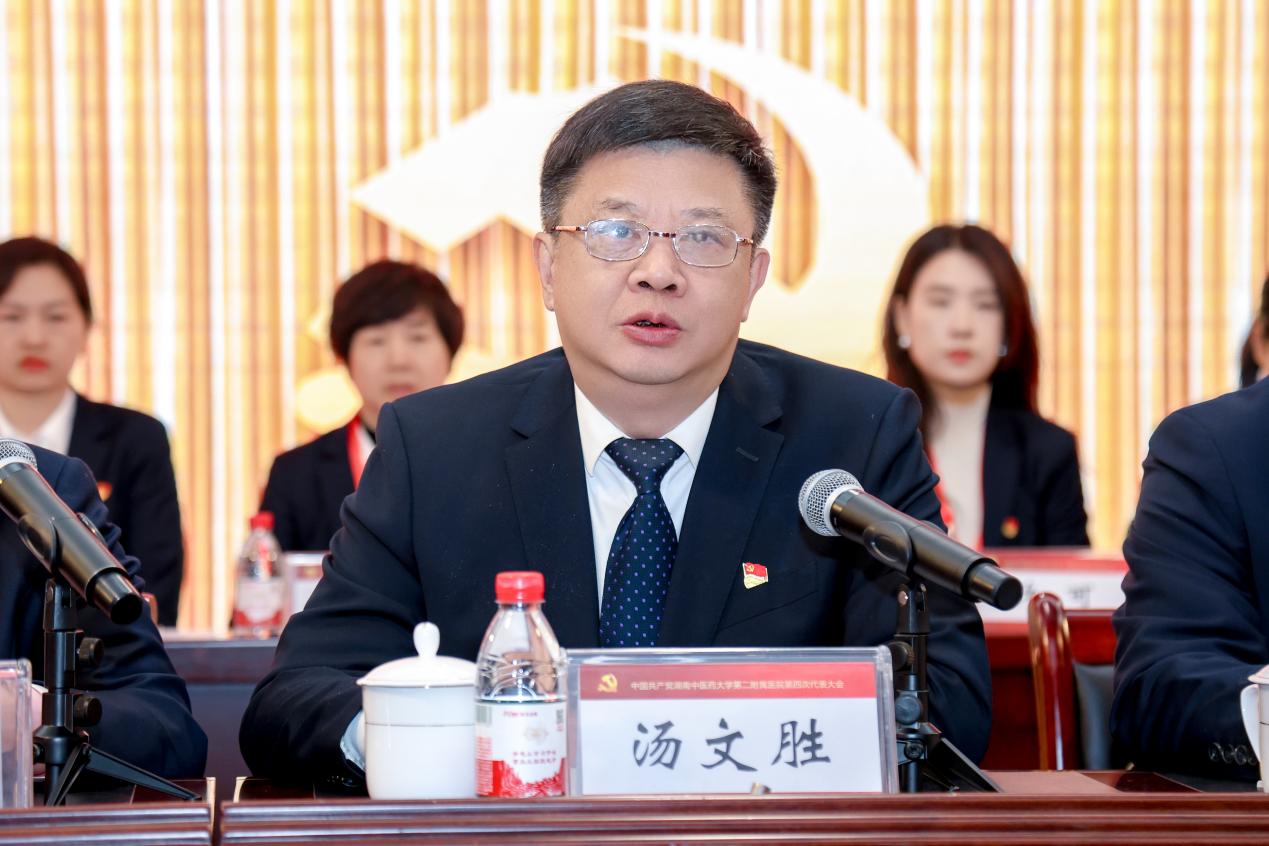 湖南中医药大学党委副书记汤文胜代表大学党委,向大会的召开表示热烈祝贺,并充分肯定与高度认可了我院近年来的发展成绩。他希望,新一届班子要旗帜鲜明讲政治,做心中有党的“明白人”,充分发挥党委把方向、管大局、作决策、促改革、保落实的领导核心作用,推动党建工作与医院中心工作同频共振、互促共进;要担当实干促发展,做心中有责的“带头人”,打造一批在全国有影响力的“专科高峰”,深化科教兴院、人才强院战略,努力打造高水平中医药人才高地和科技创新策源地;要用心用情惠民生,做心中有民的“贴心人”,坚持以人民为中心的发展思想,将患者满意作为第一标准,持续改善就医体验,优化服务流程,让群众享受到优质、便捷、高效的中医药服务;要清正廉洁守底线,做心中有戒的“清白人”,坚决扛起全面从严治党主体责任,持续深化清廉医院建设,教育引导全院党员干部职工知敬畏、存戒惧、守底线,让廉洁行医、干净干事成为附二院的鲜明底色,带领全体中医附二人劈波斩浪、勇毅前行,为健康湖南、健康中国建设作出新的更大贡献!