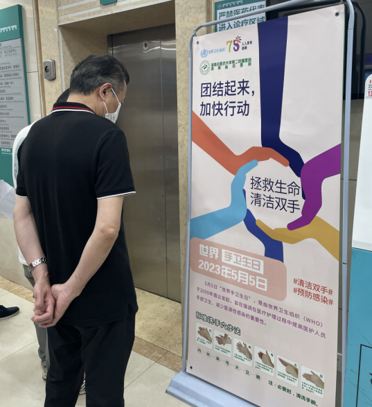 仲景楼电梯旁的宣传幅展示了本次手卫生日的主题,一位病友正认真学习正确的洗手步骤