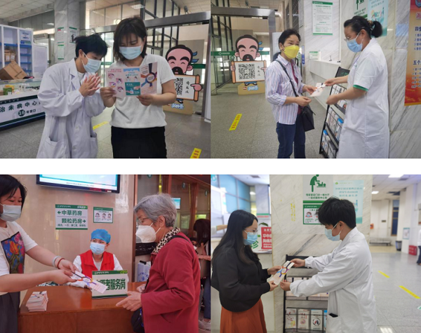 门诊医护人员正对前来就诊的患者进行手卫生日的宣传,并分发手卫生日宣传手册