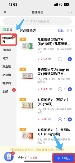 4. 返回医院公众号等待支付提醒消息→查看详情确认无误【一键购药】填写地址并支付后快递配送到家。(未绑定健康卡的用户按提示先进行绑定)