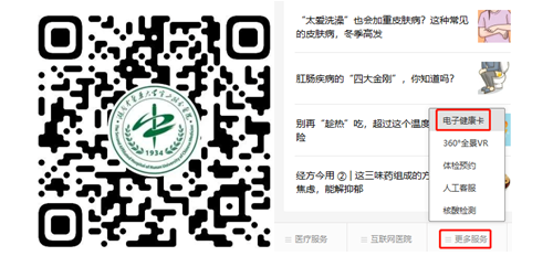 关注“湖南中医药大学第二附属医院”公众号,点击下方菜单【更多服务】-【电子健康卡】按提示绑定健康卡(已绑定用户可跳过此步骤)。