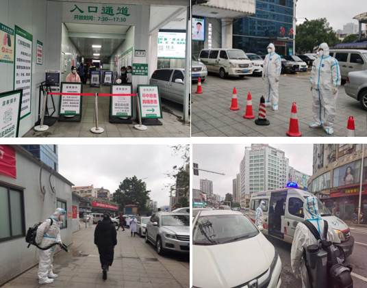 模拟场景3——医务部立即上报医院领导,开展应急处置。发热门诊人员报告主任、护士长,并通知安全保卫部进行人员管控,通知后勤保障部做好消杀准备。