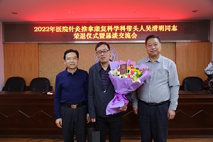 为认真贯彻落实医院干部职工荣誉退休制度,切实增强干部职工退休的荣誉感、仪式感和归属感,4月29日上午,我院首次举行干部荣誉退休仪式,用庄重、简朴而又温馨的方式,祝贺针灸推拿康复科学科带头人吴清明同志光荣退休。在家院领导、组织与人力资源部、医务部、工会、门急诊部、离退休管理科、针灸推拿康复科负责人及科室青年骨干代表参加了仪式并开展交流座谈。