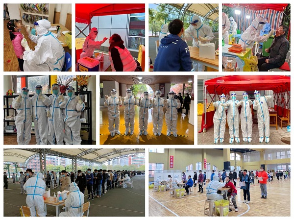 3月24日13:00,3支核酸采集支援组,共39人集结完毕,分别支援浏阳河街道、洪山街道、中山社区。17:00,10位洪山街道核酸支援小分队成员在凄风冷雨中率先出发,即便没来得及吃晚餐也毫无怨言,大家信心满满、斗志昂扬。到达洪山街道社区卫生服务中心后匆匆吃过简餐,便投入一线工作。部分小区一个晚上便完成了应检尽检的任务,这是长沙人民积极配合的成果,更是默默奋战在寒冷雨夜中一线医务人员的速度。