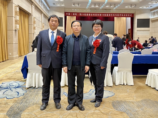 仪式前,杨声辉书记与2名援非队员欢聚交谈。杨声辉提到,两位援非医疗队队员代表着国家、湖南省和医院的形象。希望2位队员能够发扬省中医院人攻坚克难、砥砺奋进的优良传统,当好中医药文化传播的使者和当地人民的健康安全护卫,以实际行动维护好中国医疗队这块沉甸甸的金字招牌,圆满完成援外任务。同时强调“儿行千里母担忧”,医院也会当好队员们的坚实后盾,为两位援外队员做好保障和服务工作,创造良好的后方环境。望两位队员在外注意个人安全和疫情期间的个人防护,医院等待他们的平安凯旋。