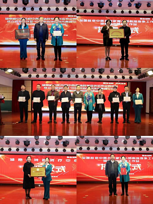 在宣读完湖南省中医药和中西医结合学会第一届外治专业委员会组成人员及党小组成立的批复文件后,邵湘宁会长给常小荣教授颁发主任委员证书,并给挂靠单位授牌;接下来,李木清院长为常小荣教授颁发全国名老中医药专家常小荣教授传承工作室湖南省中医院工作站指导老师聘书,杨声辉书记为工作站授牌,湖南省针灸学会副会长兼秘书长章薇教授为“湖南省特色灸疗中心”授牌。