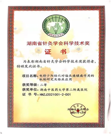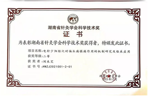 刘未艾教授团队的“电针少阳经穴对偏头痛镇痛作用的机制研究及临床应用”项目荣获科学技术奖(基础类)二等奖。