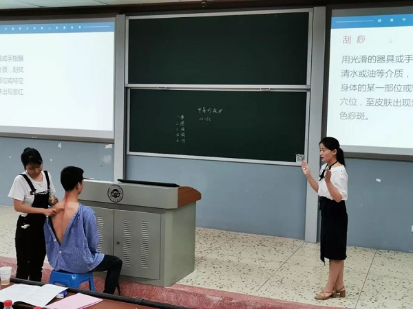 戴月老师讲盆腔炎性疾病后遗症,教导学生要谨守医疗原则,秉持人文关怀,为患者保守医疗秘密,为其创造相对隐私的就诊环境,做一位有温度,有人情味的医生。陈芳老师讲中暑的救护,现场演示中医特色的刮痧疗法,鼓励人人学急救,急救为人人,“救”在身边。