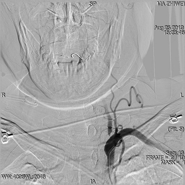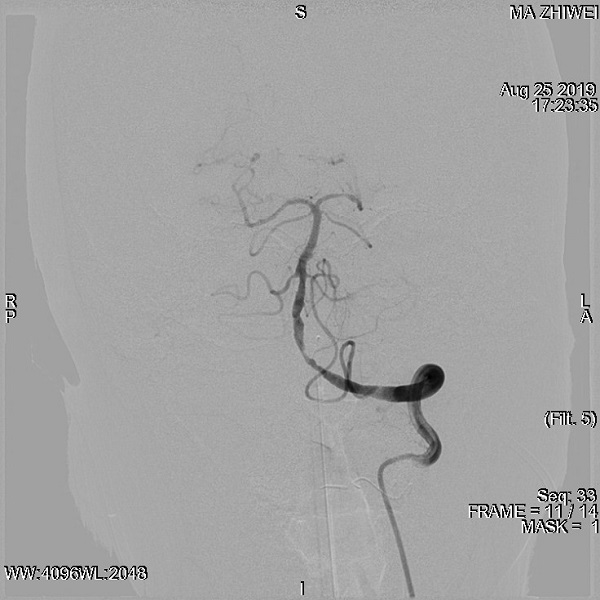 医院脑血管介入中心主任、危急重症医学科副主任、主任医师刘叶辉教授综合评估后考虑患者为急性大动脉闭塞,已经错过最佳静脉溶栓时间,患者随时可能因脑干、小脑梗死而死亡,与家属沟通后决定行介入取栓治疗。完善脑血管检查提示,左侧椎动脉起始部重度狭窄,右侧椎动脉发出大脑后下动脉以远闭塞。