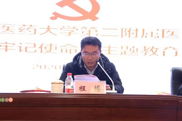 1月15日下午,我院“不忘初心、牢记使命”主题教育总结会议在外科楼25楼多功能会议厅召开,校(院)主题教育督导三组组长、发展改革处处长程博出席会议,医院在家领导班子成员、护士长以上中层干部、党员代表、学生党员代表共300余人参加会议,会议由党委副书记、纪委书记杨彤主持。