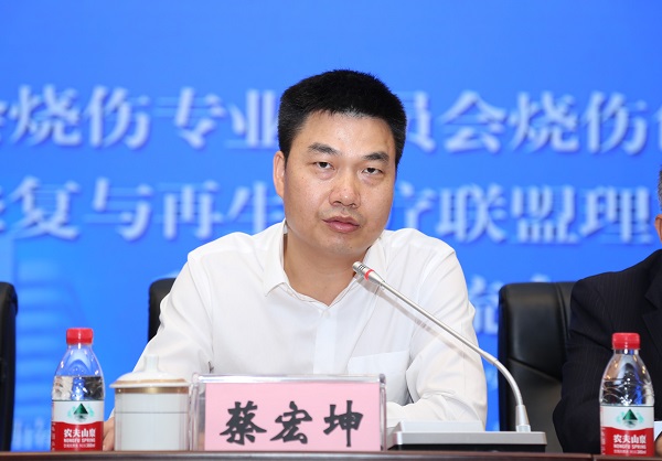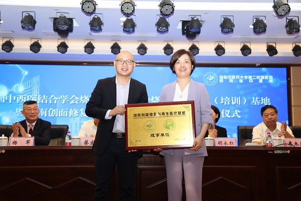 湖南省人民医院康复三科主任、湖南老年医学学会慢性创面修复与再生医疗分会主委蔡华安颁授湖南创面修复与再生医疗联盟理事单位牌匾。
