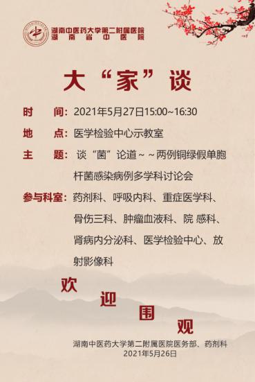 为进一步提高抗感染多学科综合诊疗水平,加强不同学科间诊疗合作,5月27日,我院成功举办谈“菌”论道——两例铜绿假单胞菌感染病例多学科讨论会。会议由医务部副部长董扬洲教授、药剂科副主任陈卫红主任药师主持,医务部、药剂科、呼吸内科、重症医学科、肿瘤血液科、骨伤三科、肾病内分泌科、医学检验中心、院感科、放射影像科、眼科等科室主任、临床专家及相关人员参加了讨论会。