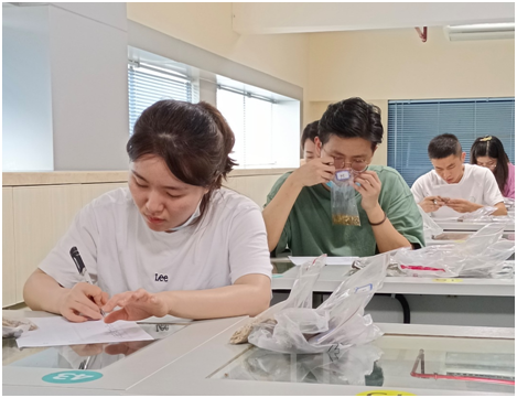 本次竞赛均为中药饮片性状鉴定竞赛。实物鉴定要求参赛选手在80分钟内完成120味中药饮片的真伪鉴定,其中混杂着诸多伪品,并写出中药饮片正品的名称或直接填写伪品的名称。比赛全面检测了选手们对中药材的熟悉程度。参赛选手一个个神情专注,沉着冷静,或屏息凝神闻味,或反复对比揣摩观形,有时取下小块放在舌尖闭目品味,时而紧锁眉头,时而莞尔一笑,时而态若冥想,比赛的氛围紧张又激烈。