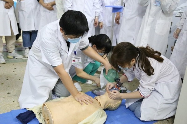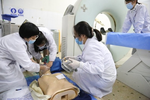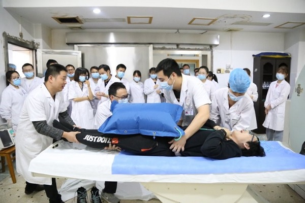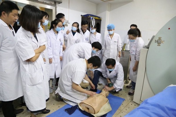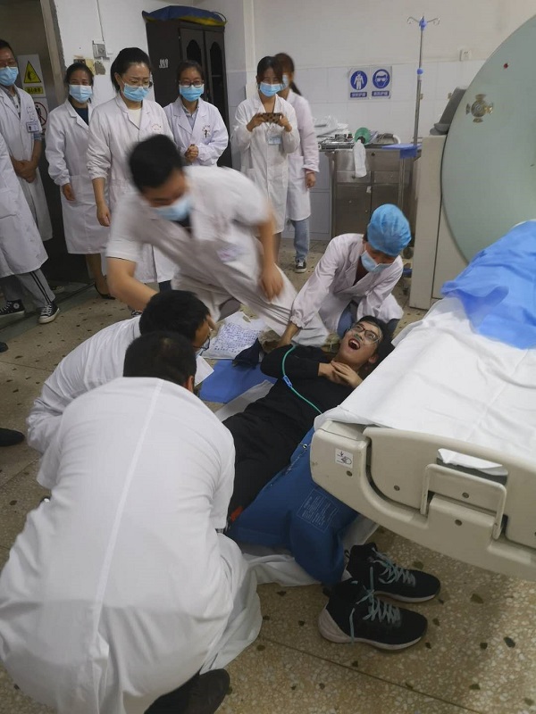 演练之前,放射科汪主任制定抢救应急预案,把科室人员分成四组,模拟日常工作分工,每组人员有技师、护士、医师及实习同学等,要求每组参与施救医护在5分钟内完成呼救、判断、医嘱、救治等所有步骤。