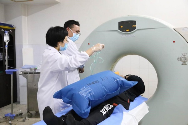▲图为CT技术员刘文浩及诊断组医生廖波,周文芳至病人身边移动病人至平坦处
