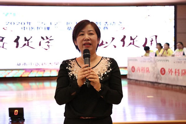 科教科科长刘杨、保健科科长贺霞、护理部副主任朱诗林等专家组成评委阵容。赛前,副院长蒋谷芬作动员讲话,鼓舞队员们的士气。她首先代表医院党委,对在临床一线、为维护人民群众身心健康而无私奉献的护理人员致以节日的祝贺和诚挚的问候。中医是中华民族的瑰宝,为人民的健康做出了不可磨灭的贡献,特别是在新冠肺炎疫情防控期间,不仅参与了社区防护新模式,更推动了中医药防控传染病现代化,为疫情防控发挥了不可替代的作用。最后,她希望,通过此次知识竞赛,进一步推进理论联系实践、专业结合临床,全院医护体系水平再上新台阶。