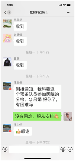 孕期依旧在岗的准妈妈,家有幼子却奋战在一线的新手爸妈,夫妻双方都奋战在一线……在此次战“疫”中,放射科有许多可敬可爱的同事,他们舍小家保大家,坚定地奋战在抗疫前沿。大家说,疫情面前我们各尽所能、精诚合作,齐心抗“疫”,这是我们作为医学影像人共同的目标!