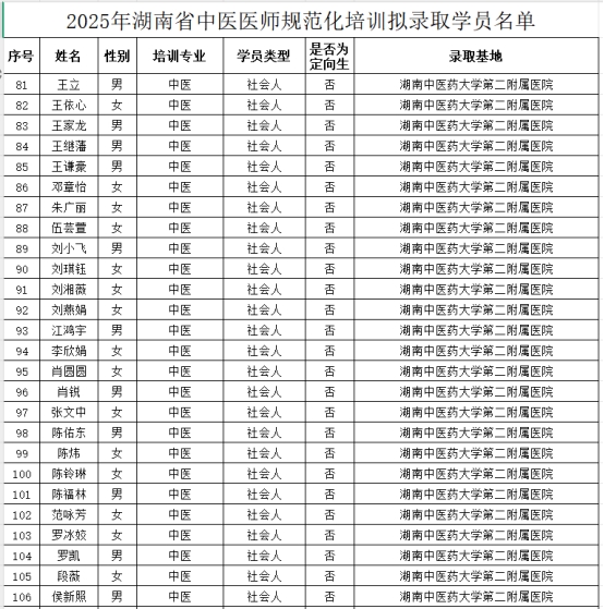 根据湖南省中医药管理局《2025年湖南省中医医师规范化培训招录拟录取名单公示》文件,具体详见湖南省中医医师规范培训管理平台(http://222.240.197.26:6061/pdsci/),我院2025年中医医师规范化培训拟录取学员人数为50人(不含并轨专硕学员),其中:中医45人,中医全科5人。现将拟录取名单予以公示: