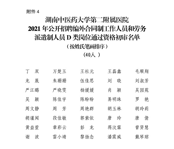 4.湖南中医药大学第二附属医院2021年公开招聘编外合同制工作人员D类岗位通过资格初审人员名单