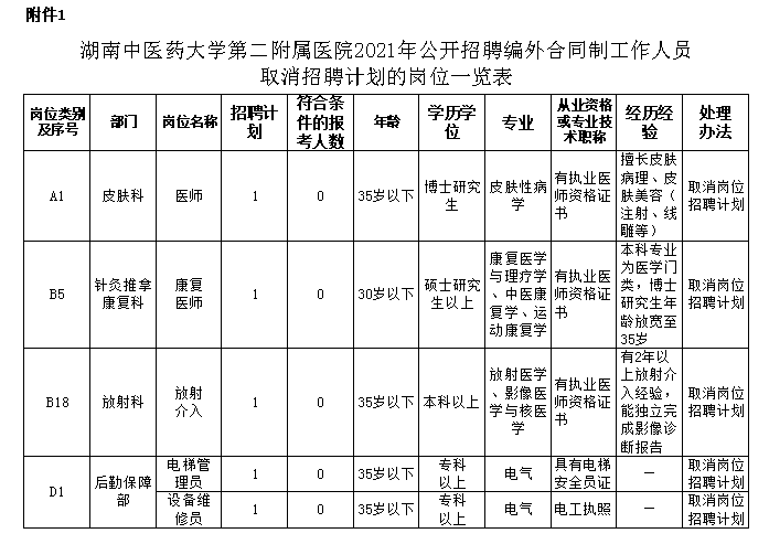 附件:1.湖南中医药大学第二附属医院2021年公开招聘编外合同制工作人员取消部分岗位招聘计划一览表