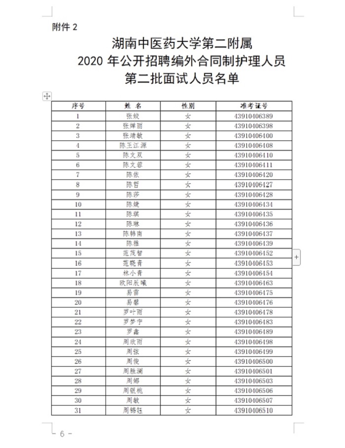 附件:1.湖南中医药大学第二附属2020年公开招聘编外合同制护理人员第一批面试人员名单
