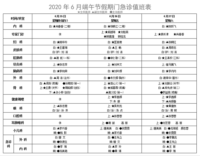 我院2020年端午节期间(6月25日—27日)门急诊与院前急救就诊安排如下: 专家门诊25日全天停诊,26日、27日下午停诊;针灸科、眼科25日—27日下午停诊;耳鼻喉科、口腔科25日全天停诊,26日、27日下午停诊;健康调理门诊25日全天停诊;其余科室正常开放。 门诊咨询电话:0731—84917810。 急诊与院前急救24小时开放,急救电话0731—8491…