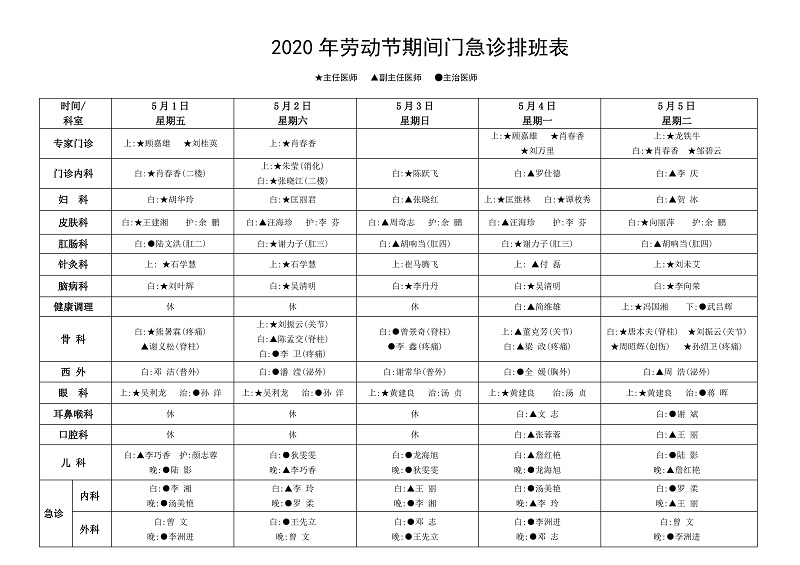 我院2020年劳动节期间(5月1日—5日)门急诊与院前急救就诊安排如下: 专家门诊1日、2日、4日下午停诊,3日全天停诊;针灸科、眼科1日—5日下午停诊;耳鼻喉科、眼科、健康调理门诊1日—3日全天停诊;眼科1日—4日下午停诊;其余科室正常开放。 门诊咨询电话:0731—84917810。 急诊与院前急救24小时开放,急救电话0731—84910120。