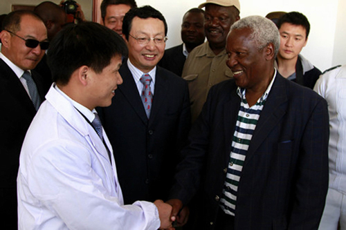 津国防部长Mahusekwa慰问我院阮红良医生,居中者为中国驻津巴布韦大使林琳 2014年5月10日,由津巴布韦中资企业商会和中国援津巴布韦医疗队共同组织筹办的“中国医疗队全国义诊活动”第六站在津巴布韦东马绍纳兰省...