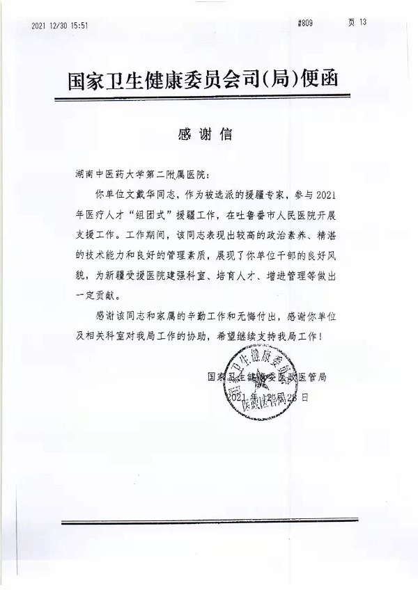 湖南省中医院(湖南中医药大学第二附属医院)神经外科主任文戴华,作为被选派的援疆专家,2021年10月参与医疗人才“组团式”援疆工作,远赴吐鲁番市人民医院担任介入医学科主任。近日,国家卫健委向湖南省中医院发来...