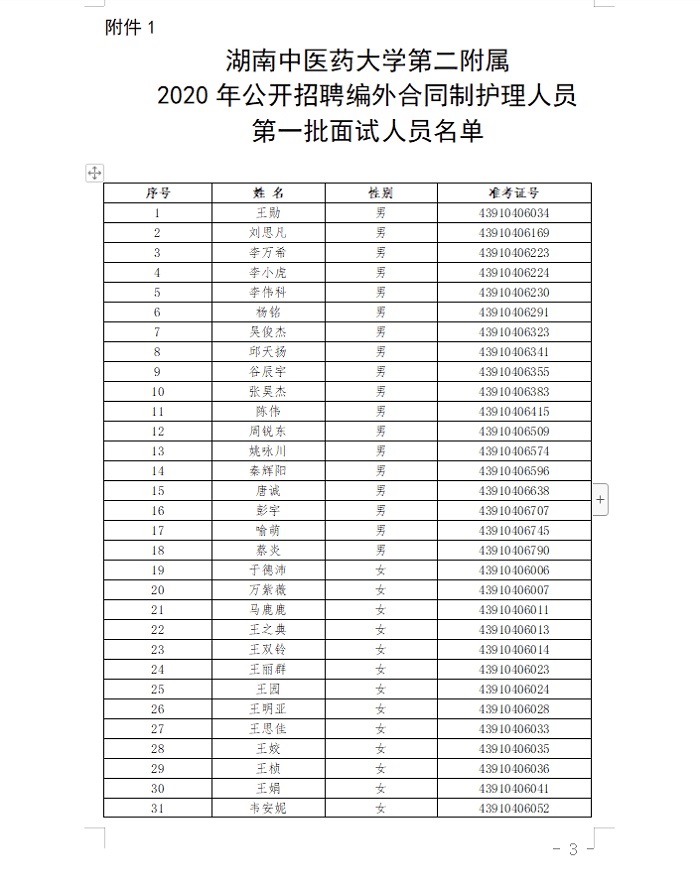通过公开报名、资格审查、笔试等程序,现将符合资格初审的843名应聘者的笔试成绩进行公示,公示期三个工作日(2020年11月4日-6日)。如有异议,请在公示期内,以实名书面形式向我院纪检监察办公室或组织与人力资源部反映。 咨询电话:0731-84917710(医院组织与人力资源部) 监督电话:0731-84917718(医院纪检监察办公室) 附件:湖南中医…