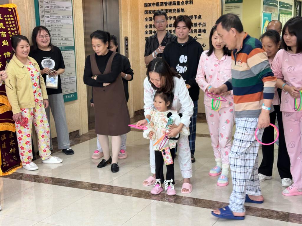 饭后休息活动除了散步还有精彩投壶和圈圈乐。“妈妈,我要套那个!”一句稚嫩的童声,让在场的所有人瞬间暖化了心窝。欢声笑语中,一位小姑娘获得了定制惊喜礼品一份。另一位患者欣喜表示:“在这里不仅得到了专业、高效的治疗,更感受到了医护人员的温暖与关怀。虽然五一假期是在医院度过,但这比我在外面度假还要开心”。真挚的分享让在场的医护人员深感欣慰和自豪。