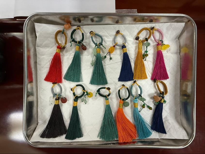 随后,“重阳问候·平安挂绳”环节温情开启。医护人员为每位病友分发编织绳、流苏与玉石吊坠,指导大家手工制作平安挂绳。玉石象征“温润安康”,流苏寓意“顺遂无虞”,15分钟后,一个个承载着美好祝愿的挂绳相继完成,成为康复路上的暖心信物。
