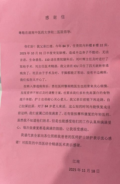 越来越多患者主动向科室表达感谢。一位脑梗偏瘫大叔含着泪对护士说:“我原来以为住院只是治病,没想到你们连喝的茶、练的动作、洗头、睡觉都替我想到了。你们教我八段锦、陪我练手、每天来看看我,我觉得自己不是一个人在康复。”另一位老奶奶则说:“我刚来时很害怕,但现在我一点不担心,因为你们比家里人都细心。”这些发自内心的反馈,让整个团队都感受到——优质服务做得越细致,患者就越愿意敞开心扉、配合治疗,也更愿意用自己的变化来回馈我们的努力。