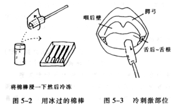 训练方法: 将冰冻棉棒蘸少许水,轻轻刺激软腭、腭弓、舌根及咽后壁,然后嘱患者做吞咽动作。如出现呕吐反射即应终止刺激; 如患者流涎过多,可对患侧颈部唾液腺行冷刺激,3次/日,每次刺激至皮肤稍发红,增强患者的感知觉。