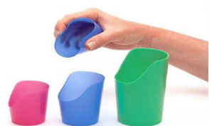 小的、表浅的圆头勺子,这样的勺子很容易将食物送入口腔内,也不需要患者张口很大,而且可以限制一口量,不至于过多,而造成误吸。张口困难,可以选择小岛勺进食。选择缺口杯进行饮水,在使用杯子时,可以采用杯沿一边高一边低的杯子或者带有切口的纸杯子(缺口杯),有助于防止颈部过伸减少误吸。