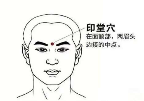 (印堂穴位于人体面部,在前额部位,当两眉头连线的中点处。)