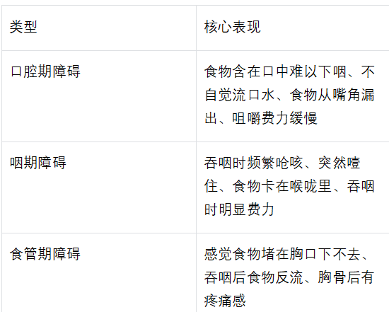 而且吞咽障碍不只是“咽不下去”这么简单,不同阶段的障碍,有不同的典型表现: