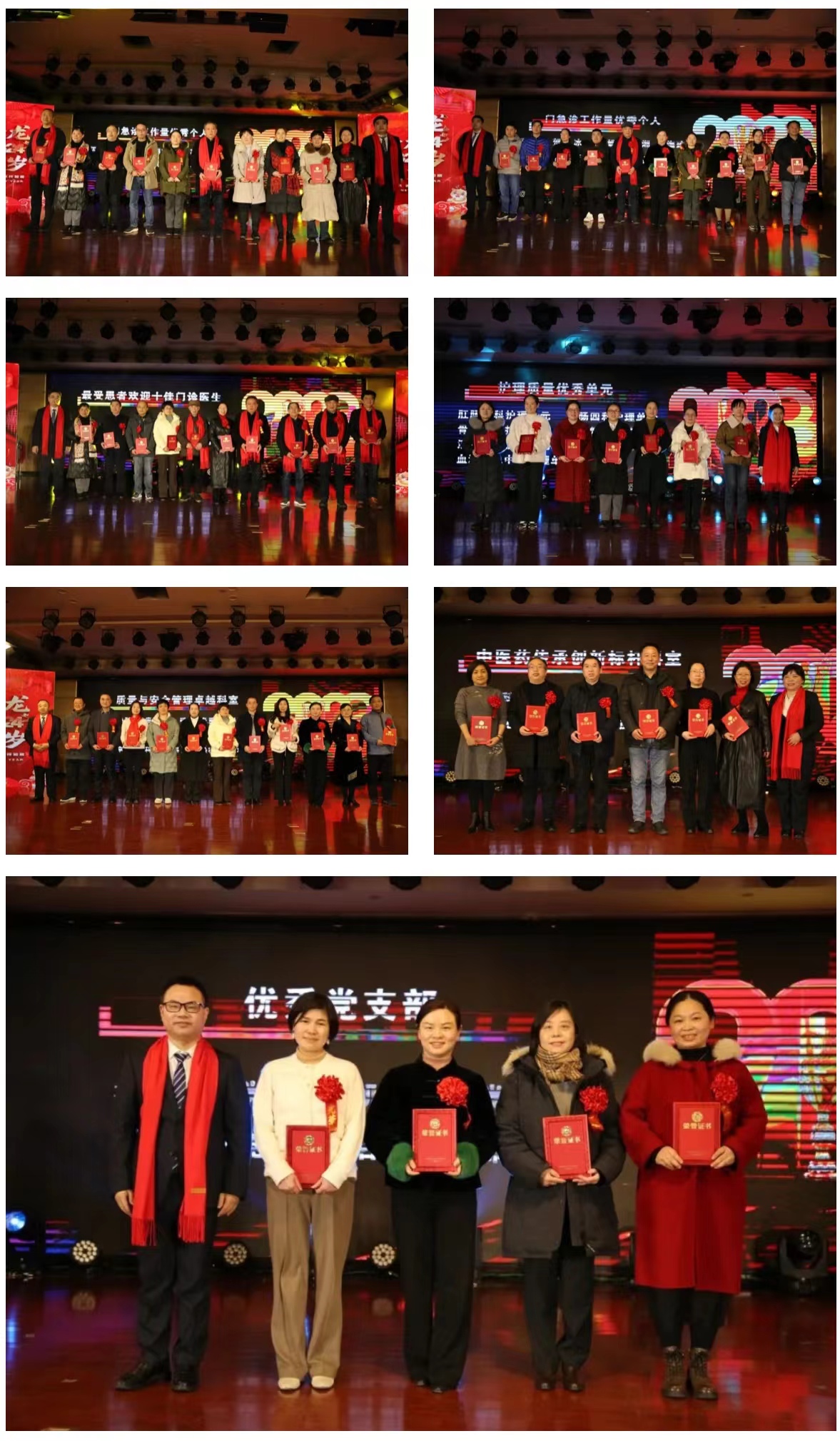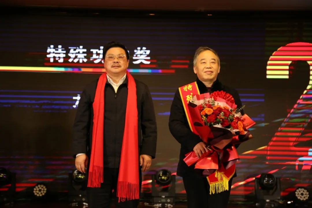 在欢快激昂的音乐中,医院2023年度优秀集体、个人代表依次上台领奖,其中“时代楷模”龙铁牛同志由大学党委书记戴爱国授予“特殊功勋奖”。