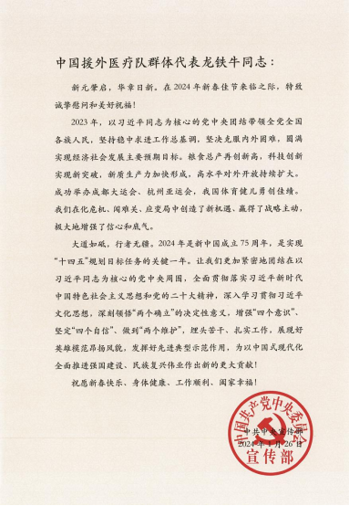 曾建立首先向大家致以新春的问候。他表示,“时代楷模”是由中国共产党中央委员会宣传部集中组织宣传的全国重大先进典型,是具有很强先进性、代表性、时代性和典型性的先进人物,其评选过程充分体现了高标准、严要求、程序规范严密的特点。近年来,党中央和中宣部十分重视对“时代楷模”的推选、宣传以及礼遇和关怀。2023年10月,在中国援外医疗队派遣60周年之际,中宣部向全社会宣传发布包括龙铁牛教授在内的中国援外医疗队群体代表的先进事迹,授予他们“时代楷模”称号,在国际和国内都引起了热烈反响。龙铁牛教授是湖南省唯一一位获评“时代楷模”中国援外医疗队群体代表的医疗专家,中宣部对其为国家和社会作出的贡献表示由衷敬意,下一步将继续加强对中国援外医疗队群体代表先进事迹的宣传,号召全社会以“时代楷模”为榜样,让“时代楷模”精神持续发挥引领和激励作用。